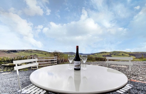 Outside – Enclosed patio area along the front of the two cottages with a central porch area creating a private corner for each cottage. Garden furniture and barbeque provided. Expansive views across the valley towards the Cambrian Mountain range with no road or car in sight. There is also a further enclosed garden with play area next to the property.