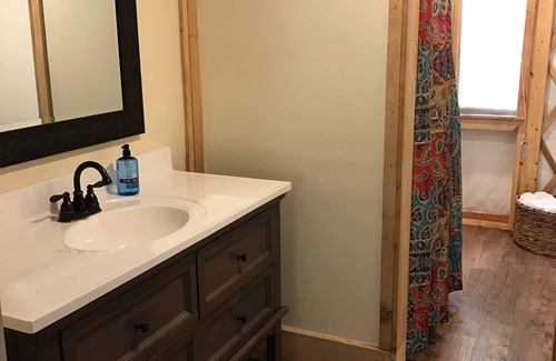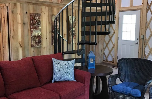 Downstairs, there is a cozy living area that offers couches where guests can put their feet up and relax in front of a movie on the cable TV after an amazing day spent down at the river. There is also Wi-Fi in the yurt to ensure that guests can stay in touch with loved ones during their vacation.