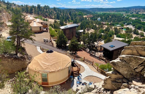Welcome to "The Cliff Dwelling Yurts" at East Zion Resort! We believe the places you stay while on vacation should be a unique and fascinating experience! Stunning views in all directions, spectacular sunsets every night & dark sky for stargazing. Each yurt has been designed with its own private bathroom, WIFI, heating & a/c, kitchenette, gas fire pit, & gas grill. Two Resort Pools, Lazy River, 4 Hot Tubs & Pickleball Courts will keep you relaxed and entertained at East Zion Resort!