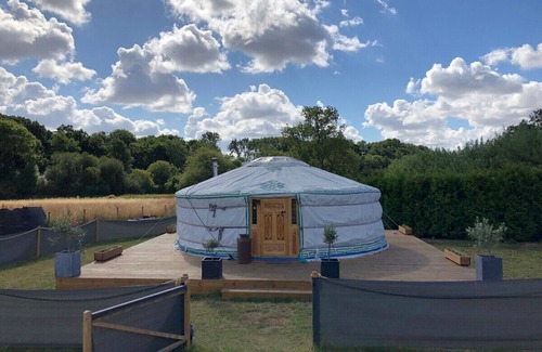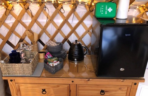 This area is situated near a 4-acre meadow and wood, on the other side a shepherd's hut and a chalet. With free parking onsite, drinking water can be found at the outdoor tap sourced from our very own borehole. The yurt itself has a garden that is fenced off with 3-foot-high screening. only about 20 yards from the spa area. We're just outside the village Chackmore with the pub "Queens Head" just a 10 minute walk away.