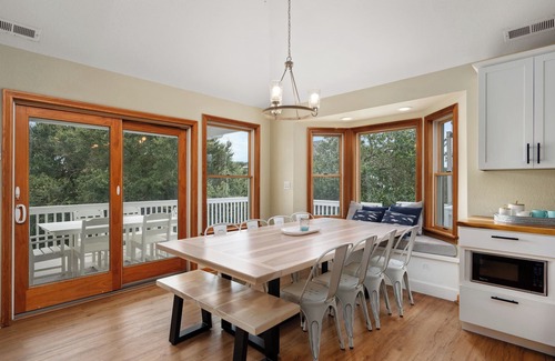 At Z's By The Sea, you'll find an array of top-notch features designed for comfort and entertainment. The expansive private pool area, complete with a hot tub, serves as your very own oasis, surrounded by lush trees for privacy. Ideal for large groups, the home includes a game room and den, providing ample space for gathering and celebration. With a reverse floor plan showcasing an open-concept living area on the top level, you’ll appreciate the vaulted ceilings and contemporary furnishings. The chef-inspired kitchen boasts granite countertops and two dishwashers, making it easy to cater to your wedding party's needs. Plus, the multiple covered decks allow for seamless indoor-outdoor living, making it easy to enjoy the coastal ambiance while grilling up delicious meals.