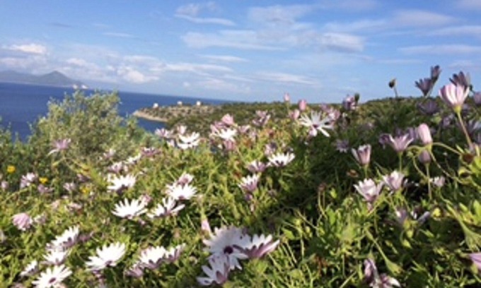 The garden, with its 3 tiered terraces, is set within former olive groves, provides a stunning panoramic view across the sea to the windmills that characterise the entrance to the bay.