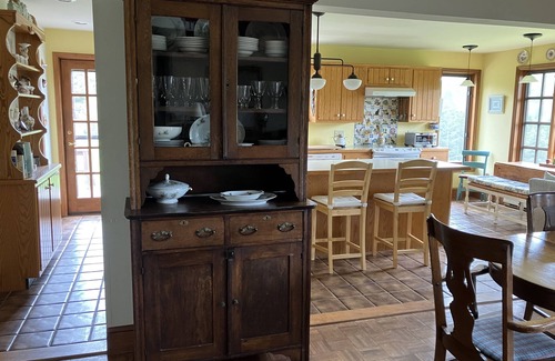 The house is relaxed, yet refined. All four bedrooms are spacious, and feature additional single beds and/or pull-out sofas, ideal for children who prefer to sleep with their parents. The large master bedroom has an en-suite bath and walk-in closet. Bathrooms are fully supplied with towels, soap and shampoo. The fully equipped, sun-filled eat-in kitchen has updated appliances and everything you need for cooking, baking, and dining. The airy living/dining room features a wood-burning stove and a double-height cathedral ceiling. The sunny ground-level floor opens out to a lawn and has a Pop-A-Shot hoops game, Foosball table, and play area with dollhouse for small children. Rounding out the house are a covered porch, and an expansive deck for grilling and dining, both with beautiful views of the countryside. Other amenities include firewood, high-speed wifi, a 40” smart TV, new high-capacity washer and drier, and stocked bookshelves to browse.
