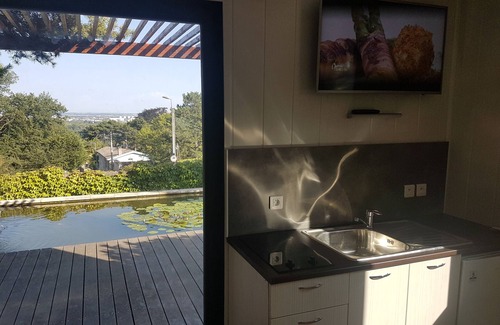 20m2 chalet located on the edge of a pool that can accommodate two people