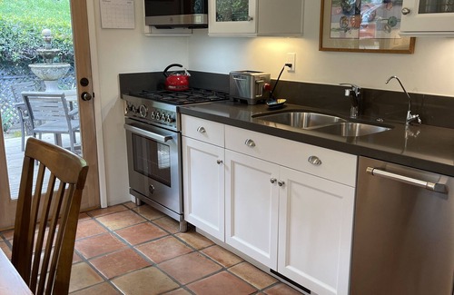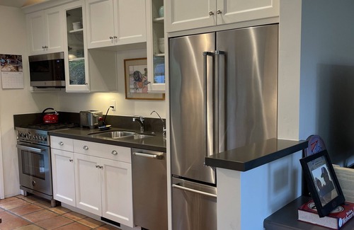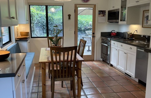 This thoughtful appointed , small home has recently been remodeled and is clean and tidy. Spacious and comfortable, it has two bedrooms, one with a king bed and one with a queen. The bathroom is gorgeous, with a luxurious bathtub with views to outdoor fountain meditation area - where you can watch the birds bathe as well. Enjoy cooking in the full kitchen and relaxing in the welcoming dining area, or BBQ-ing outside and dining al fresco. The home also includes a full laundry, as well as a large TV, and includes cable and internet...