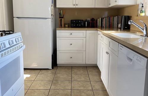 Kitchen with fridge/ freezer, gas stove/oven, dishwasher, kettle, toaster, blenders, juice machine. Ceiling fan