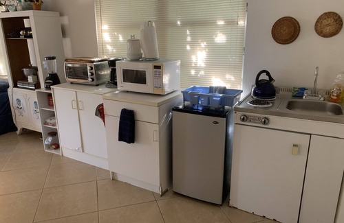 Many people have inquired asking about Hurricane Ian. While many in my community were devastated by flooding, my property and i were very fortunate that we were at a high enough elevation so the flood only came up my driveway but not all the way into my home. The property/my zen garden was impacted somewhat by the wind but the plants and trees have begun growing back and life is returning to “normal.” The guest houses are comfy but not fancy. I have reduced the nightly rate due to hurricane impact on the property and hope the small “damages” have been fixed before you book or arrive but also hope you understand that finding workers available in this area for “small” jobs is almost impossible while they are busy rebuilding entire homes. A month discount is also automatically applied thru this site.