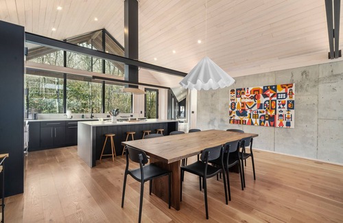 Tucked away in the Blue Ridge Mountains, Wander Black Mountain is a modern Scandinavian cabin designed by architect Michael Neiswander. Just outside Black Mountain and a short drive from Asheville, this retreat provides a unique design experience with a feeling of "sleeping in the trees." With accommodation for up to 12 guests, floor-to-ceiling windows, and a private hot tub, this home is perfect for a family getaway or group retreat.