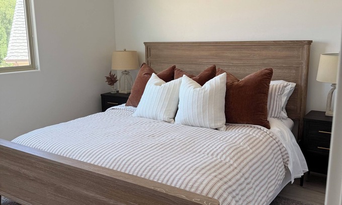 This brand-new, professionally designed 2-bedroom apartment offers a peaceful retreat just minutes from Zion National Park. With space to sleep up to 6 guests, it features one king bed and a queen-over-queen bunk bed—perfect for families or groups.