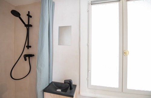 It is situated between the ground floor and the 1st floor of the building. You will enjoy a comfortable 140X190 double bed with its HD TV and a desk to work. There is also a nice fully equipped little kitchen with everything you need to cook, as well as bathroom, with a shower and toilets.