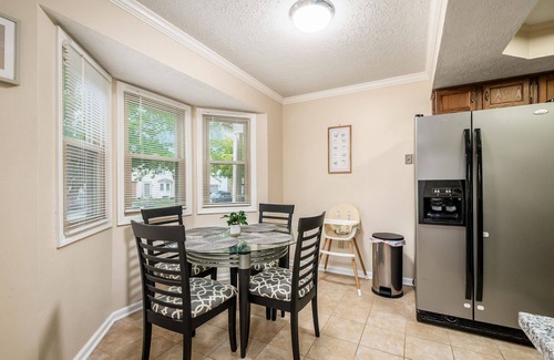 • Bright dining area with bay windows, a high chair for children, and seating for 4—perfect for morning pancakes or cozy dinners
