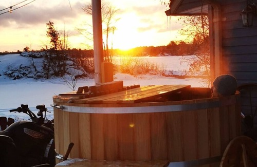 Immerse yourself in our Cedar Hot Tub, located under a lakeside gazebo. Each hot tub is prepared specifically for you—cleaned and refilled with 3500 liters of pure lake water before your arrival, free of any chemicals. It will be preheated with wood before your arrival, a process that may take up to 24 hours depending on weather conditions. The hot tub comes equipped with bath robes, towels, and required firewood.