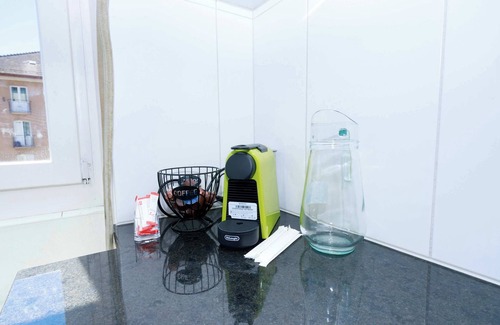 Fully equipped kitchen with coffee machine, kettle, toaster, oven, stove, and dishwasher
